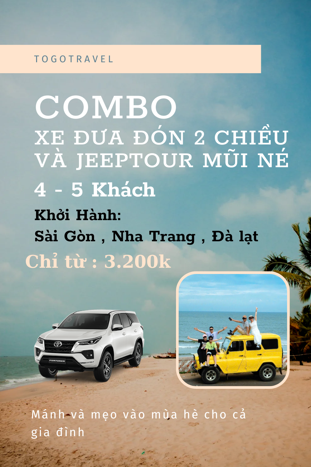 Khám phá vẻ đẹp hoang sơ của đồi cát bay, suối Tiên và làng chài Mũi Né với dịch vụ Jeep Tour độc đáo. Tận hưởng hành trình bình minh hoặc hoàng hôn đầy cảm xúc cùng tài xế bản địa nhiệt tình, xe jeep sống ảo cực chất!